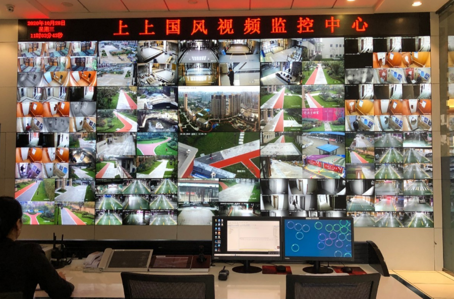 在隨后的視察中,視察組來到了24小時監控室,詳細了解了智能網絡監控系統的電子大屏,設備上有360度云臺攝像頭、鷹眼監控傳送的實時動態畫面,整個小區監控動態在此大屏都可看到。