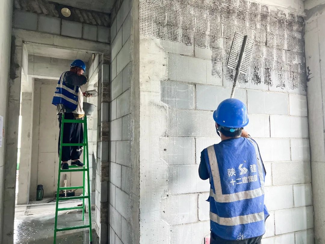 各樓棟主體施工正按工程節點穩步推進,目前已進入二次結構施工階段。施工團隊嚴格遵循國家建筑規范標準,采用甩漿工藝進行砌體墻面基層處理,確保粉刷層粘結牢固,為后續施工奠定堅實基礎。