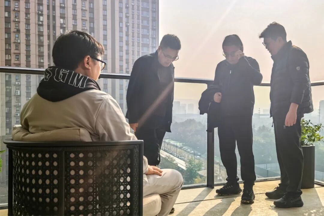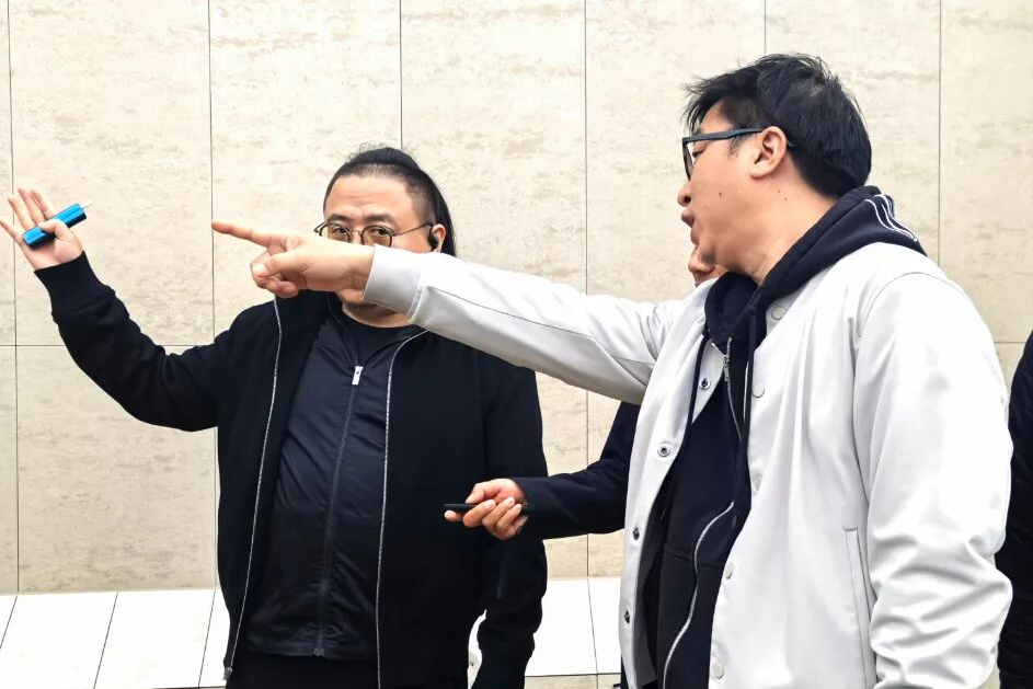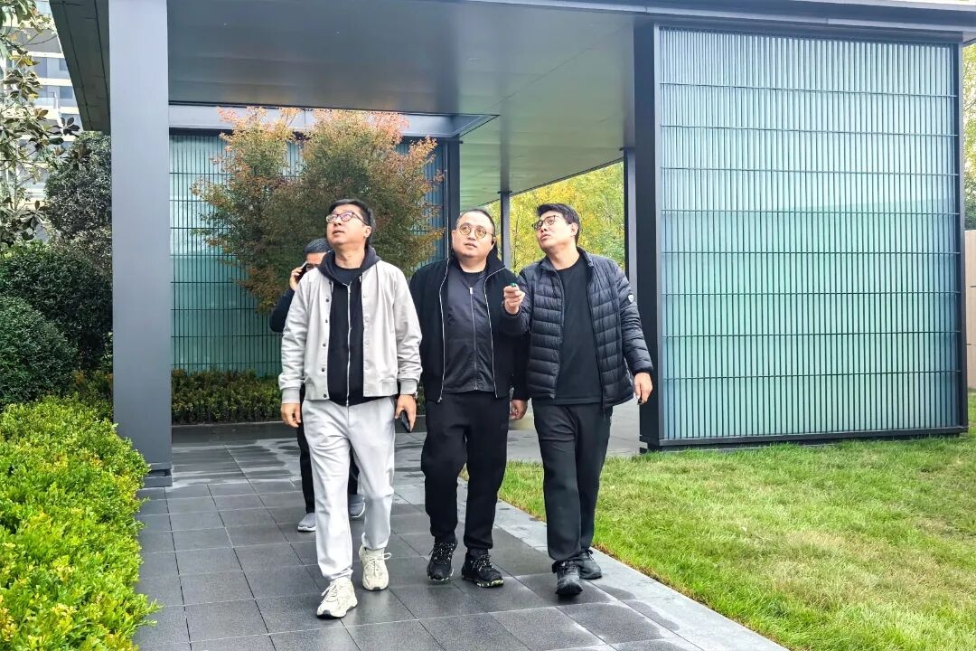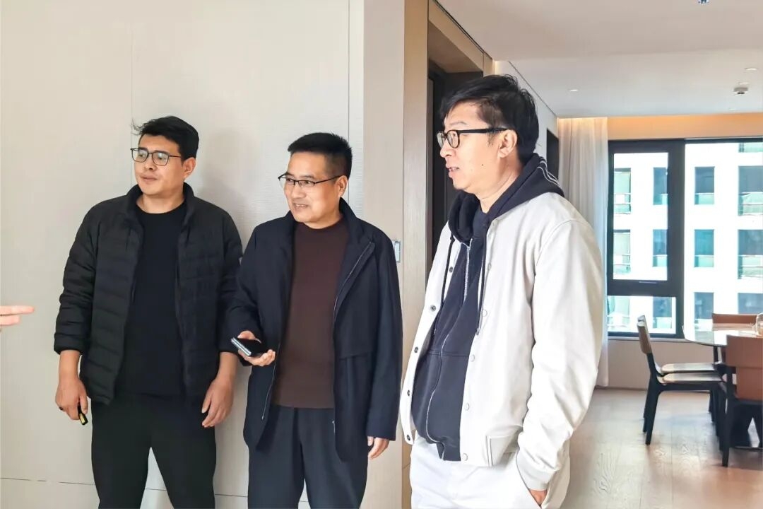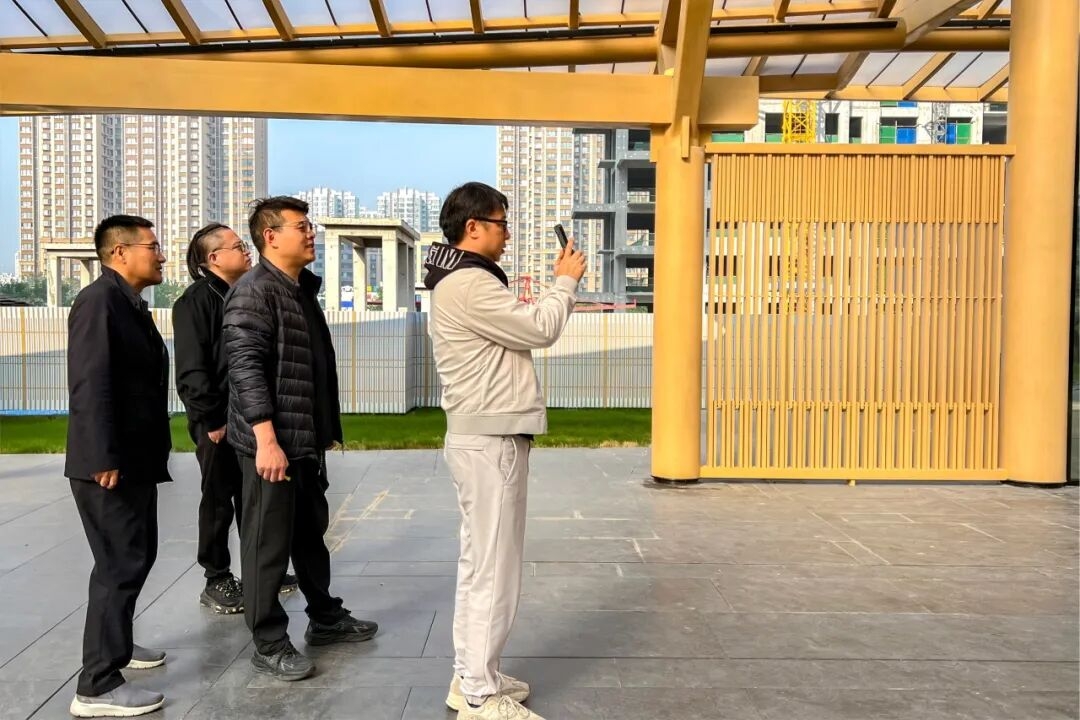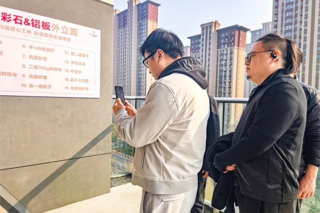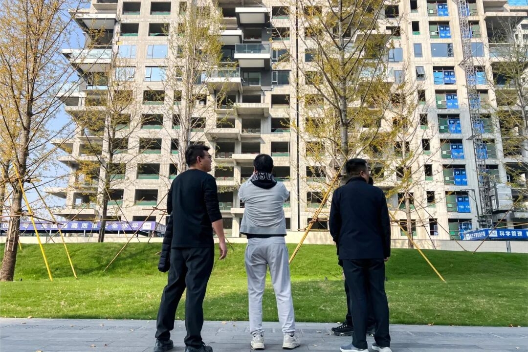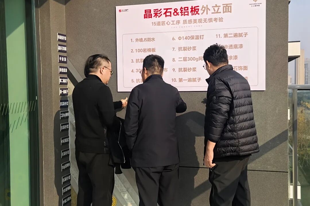 此外,張兵還通過遠景、近景等不同角度查看了建筑立面樣板。并圍繞施工工藝優化、材料耐久度、外立面材質選擇與落地質感等方面,與上上團隊現場展開深度交流。