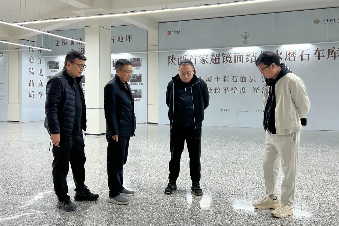 隨后一行人深入工地現場,重點參觀陜西首家超鏡面結晶水磨石車庫,并實地查看了地上地下雙精裝入戶大堂、工藝工法樣板、毛坯&精裝樣板間等展示區域。