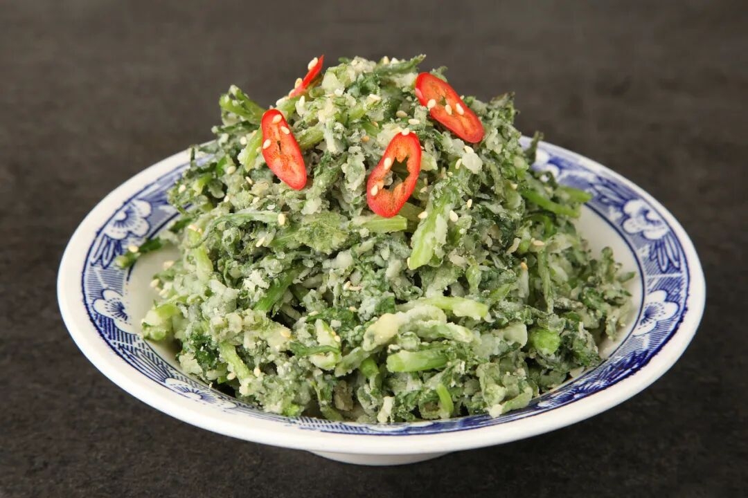 裹粉抓勻:將紅薯葉放入一個(gè)大碗中,撒上適量的面粉或玉米粉,用手輕輕抓勻,讓每一片葉子都均勻地裹上一層薄薄的干粉。這一步可以鎖住水分,使蒸出的菜葉不粘連、口感干爽。