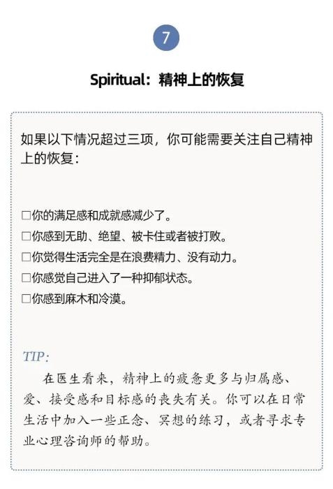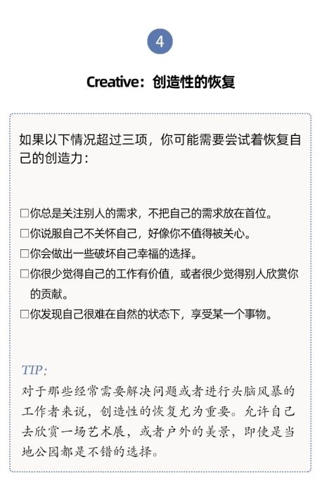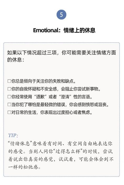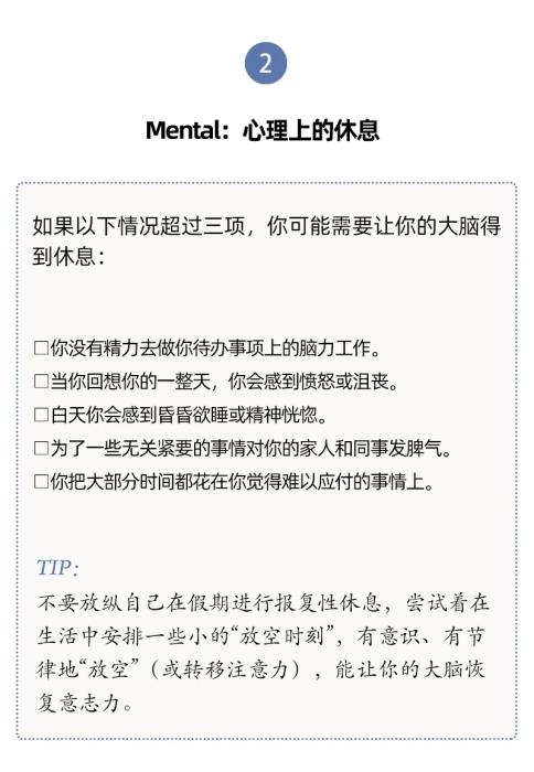 人們對于休息有不同層面的需要,休息與每一天的生活息息相關。單靠某一個具體的假期、某一種具體的活動(社交或者睡覺),并不能讓我們恢復到完全休息好了的狀態。