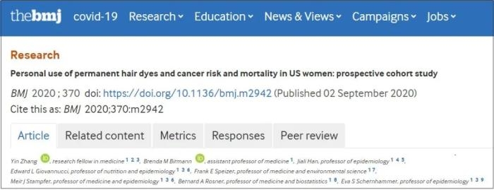 少用永久性染發(fā)劑,2020年,發(fā)表在《英國醫(yī)學(xué)雜志》上一項(xiàng)大型前瞻性隊(duì)列研究發(fā)現(xiàn),使用永久染發(fā)劑與皮膚癌、乳腺癌、卵巢癌、淋巴瘤發(fā)病風(fēng)險(xiǎn)增加有關(guān)。