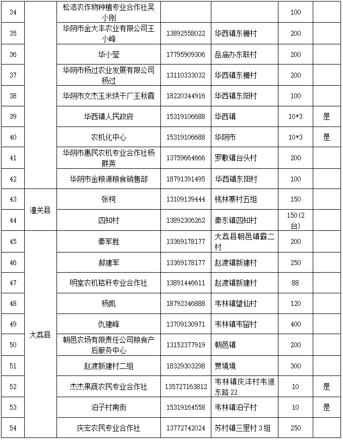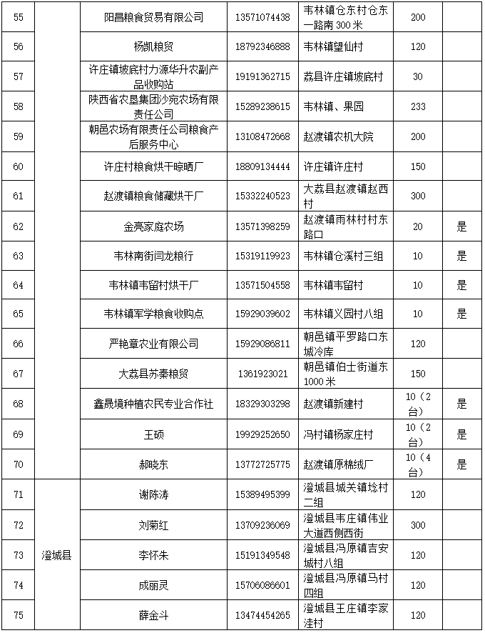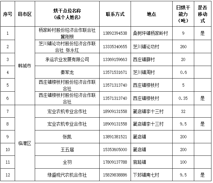 當(dāng)前渭南市秋糧已進(jìn)入收獲關(guān)鍵期,為應(yīng)對(duì)“三秋”極端降雨天氣,確保糧食顆粒歸倉(cāng),渭南市糧食烘干設(shè)備已做好準(zhǔn)備。渭南市農(nóng)業(yè)農(nóng)村局現(xiàn)將全市糧食烘干服務(wù)點(diǎn)公布如下: