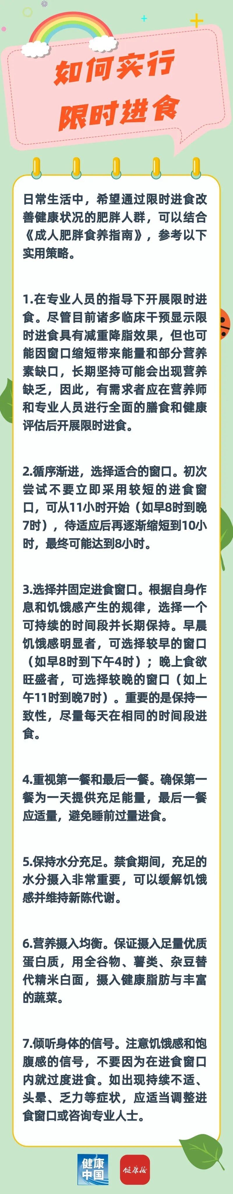 因此,理想的限時進食應當同時重視進食窗口的時間規劃與進食窗口內的飲食質量,即在符合人體晝夜節律的進食窗口內,選擇營養全面的食物和營養素,保持健康的膳食結構。