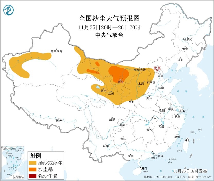 預計,25日20時至26日20時,新疆南部、內蒙古西部、甘肅、寧夏、陜西中北部、山西等地有揚沙或浮塵天氣,其中甘肅西部、內蒙古西部、寧夏北部等地的部分地區有沙塵暴(見圖2)。因此,中央氣象臺11月25日18時發布沙塵暴藍色預警。