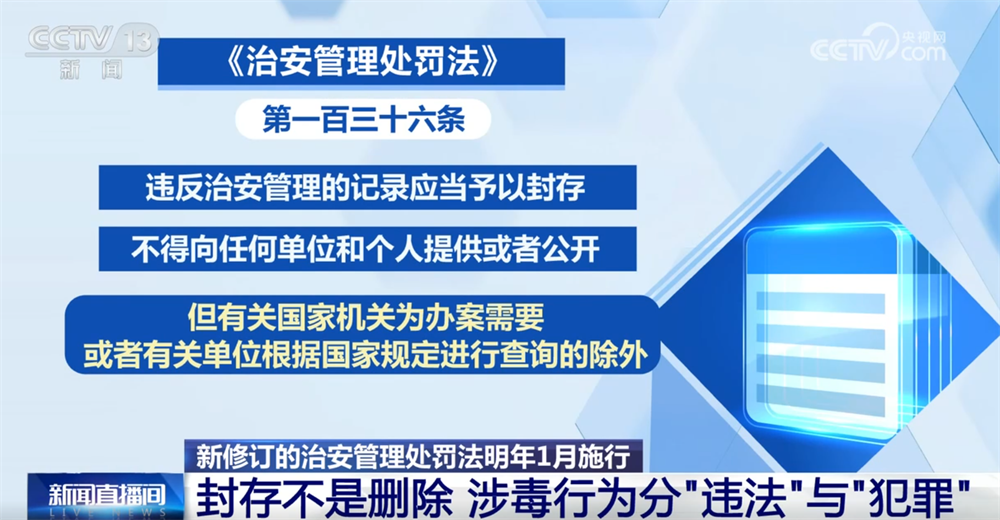 央視網消息:將于明年1月1日起實施的新修訂《中華人民共和國治安管理處罰法》中第一百三十六條確立的“治安違法記錄封存制度”近日引發關注,其中,因吸毒有治安處罰記錄也在被封存的范圍內引發熱議。一邊是每年超800萬曾受治安處罰群體對“擺脫終身標簽”的期待,一邊是公眾對“記錄封存是否等同于縱容違法”“是否為特定人群開綠燈”的擔憂,圍繞這些熱點問題,我們來看一看專家怎么說。