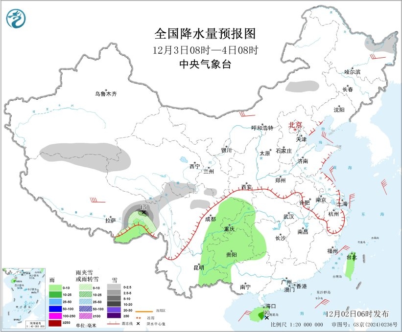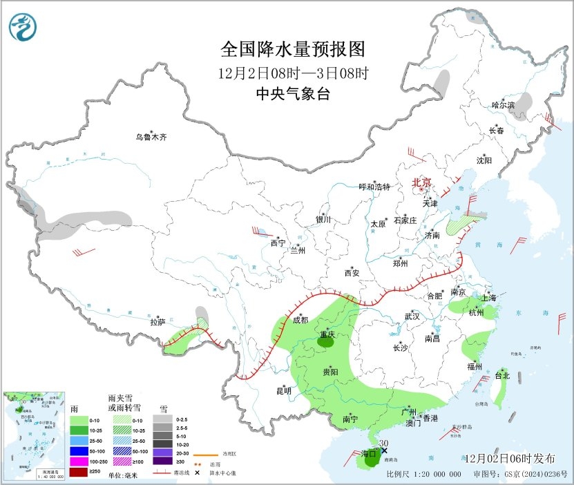 12月2日08時至3日08時,黑龍江西北部和南部、新疆南疆盆地、西藏東北部和東南部、山東半島、遼東半島等地部分地區有小雪或雨夾雪,其中,新疆南疆盆地等地部分地區有中雪。浙江北部、福建東北部、西南地區東部、華南大部、海南島等地部分地區有小到中雨,其中,海南島東北部等地部分地區有大雨(25~30毫米)。內蒙古中部、西藏中北部、青海東部、山東半島、遼東半島等地部分地區有5~6級風。渤海、渤海海峽、黃海大部海域、東海大部海域、臺灣海峽、臺灣以東洋面偏北海域、巴士海峽偏北海域、南海北部海域將有7~8級、陣風9~10級的大風。
