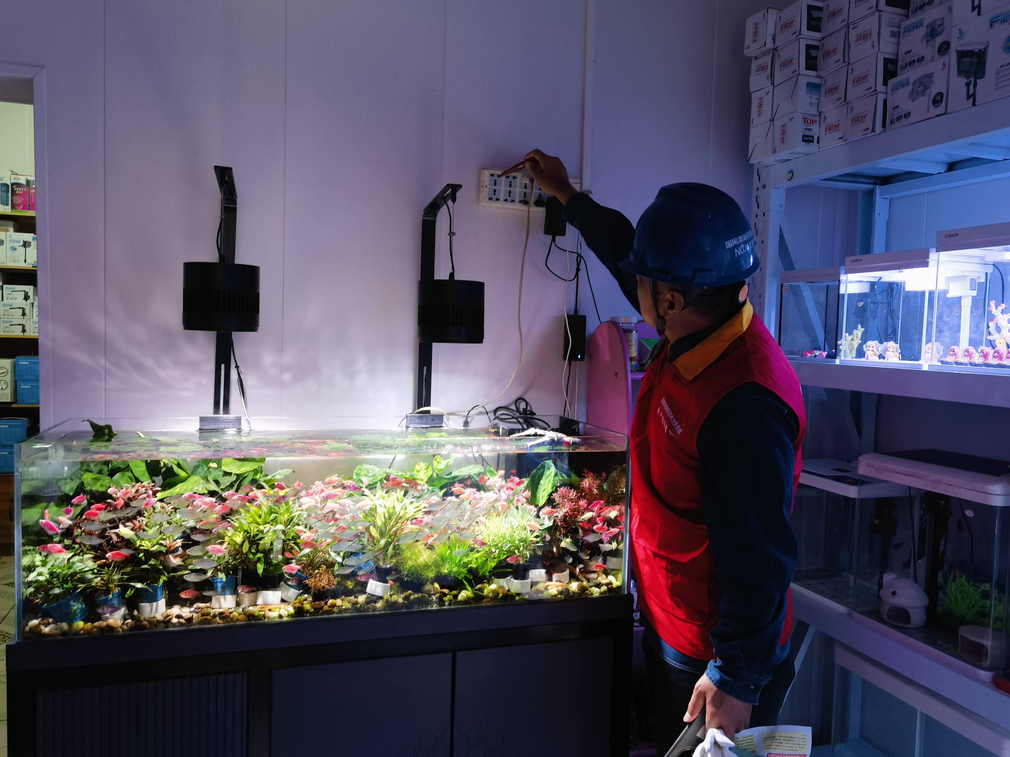 在人民街吳女士精心經營的水族館內,內循環(huán)水流潺潺,增氧設備低鳴,燈光映照著斑斕魚影。這份生意盎然的“蔚藍世界”,其背后是持續(xù)的電力支撐。“紅馬甲”們細致檢查了總閘、表箱到內部線路的每一處節(jié)點,確保生命線安全無虞。同時,借助專業(yè)工具對館內魚缸恒溫加熱器、循環(huán)水泵、照明系統等核心用電設備的能耗狀況進行了科學評估,精準定位優(yōu)化空間,挖掘低碳潛力。