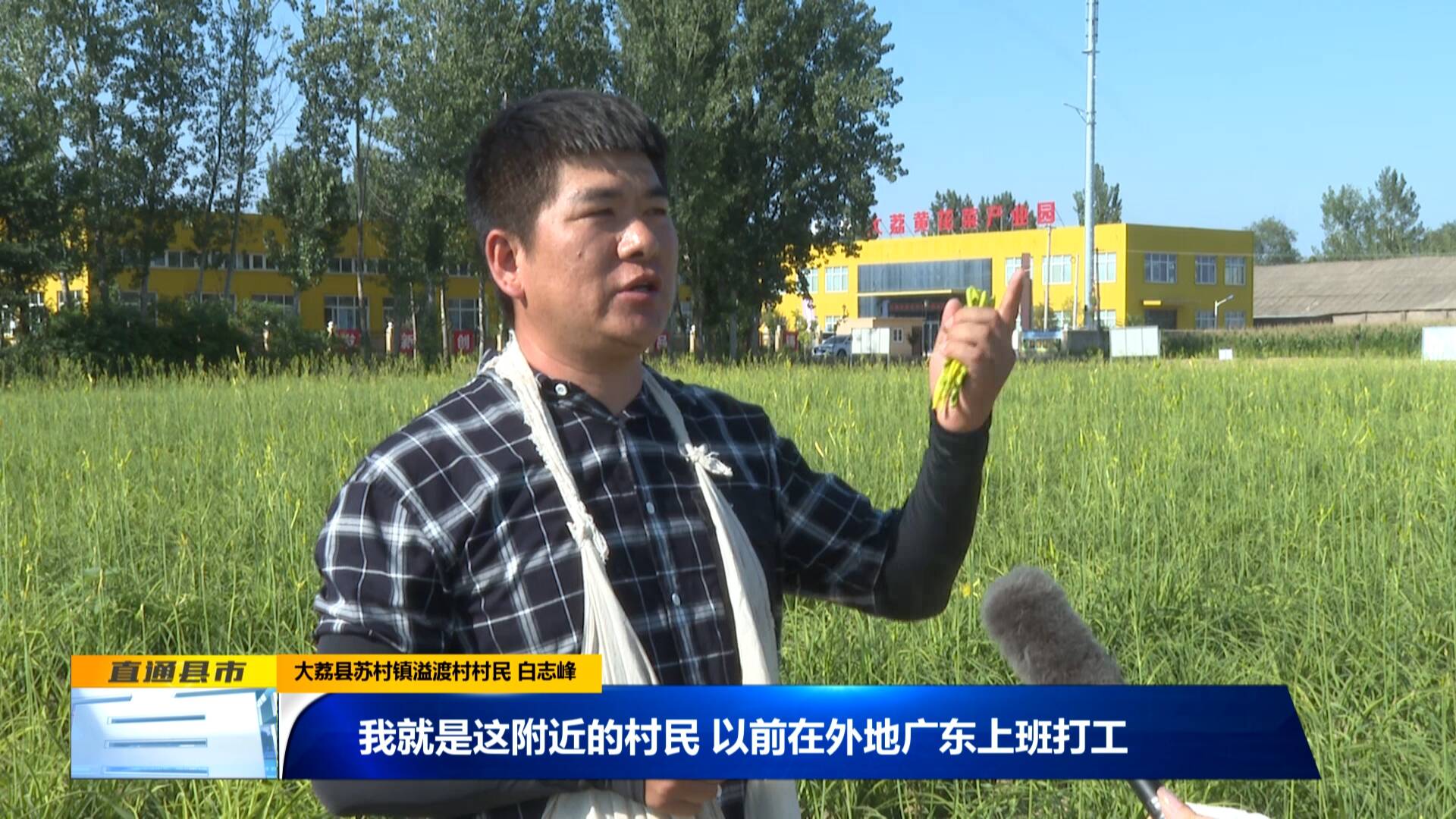 大荔縣蘇村鎮溢渡村村民 白志峰:“我就是這附近的村民,以前在外地廣東上班打工,現在剛好附近有這個產業園能上班,按斤回收,一斤1塊5毛錢。我一天下午和早上能折200斤黃花菜,就是300元左右,這收入我現在非常滿意,比(外出)打工真正強得多?!?/p>