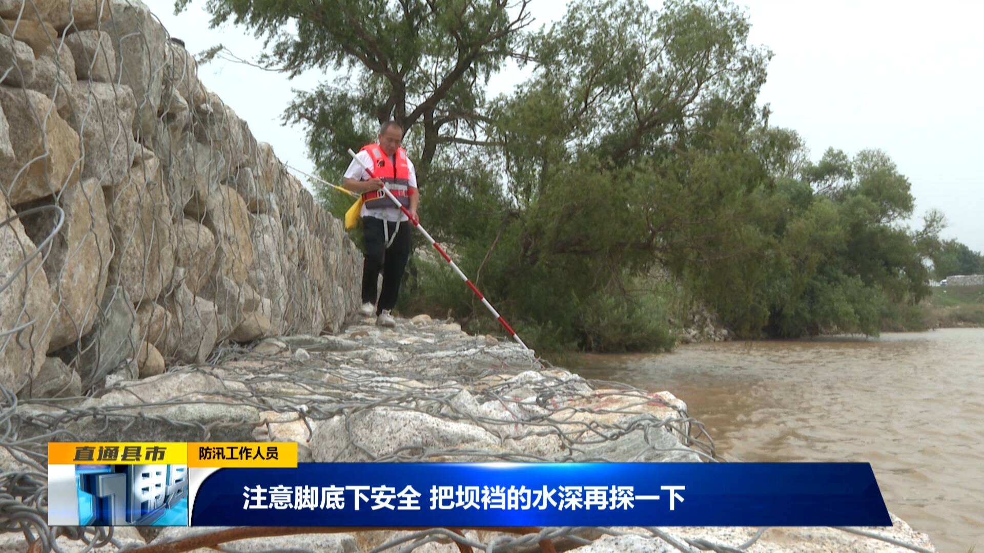 防汛工作人員:“注意腳底下安全,把壩襠的水再看一下,水深大概兩米五左右。”