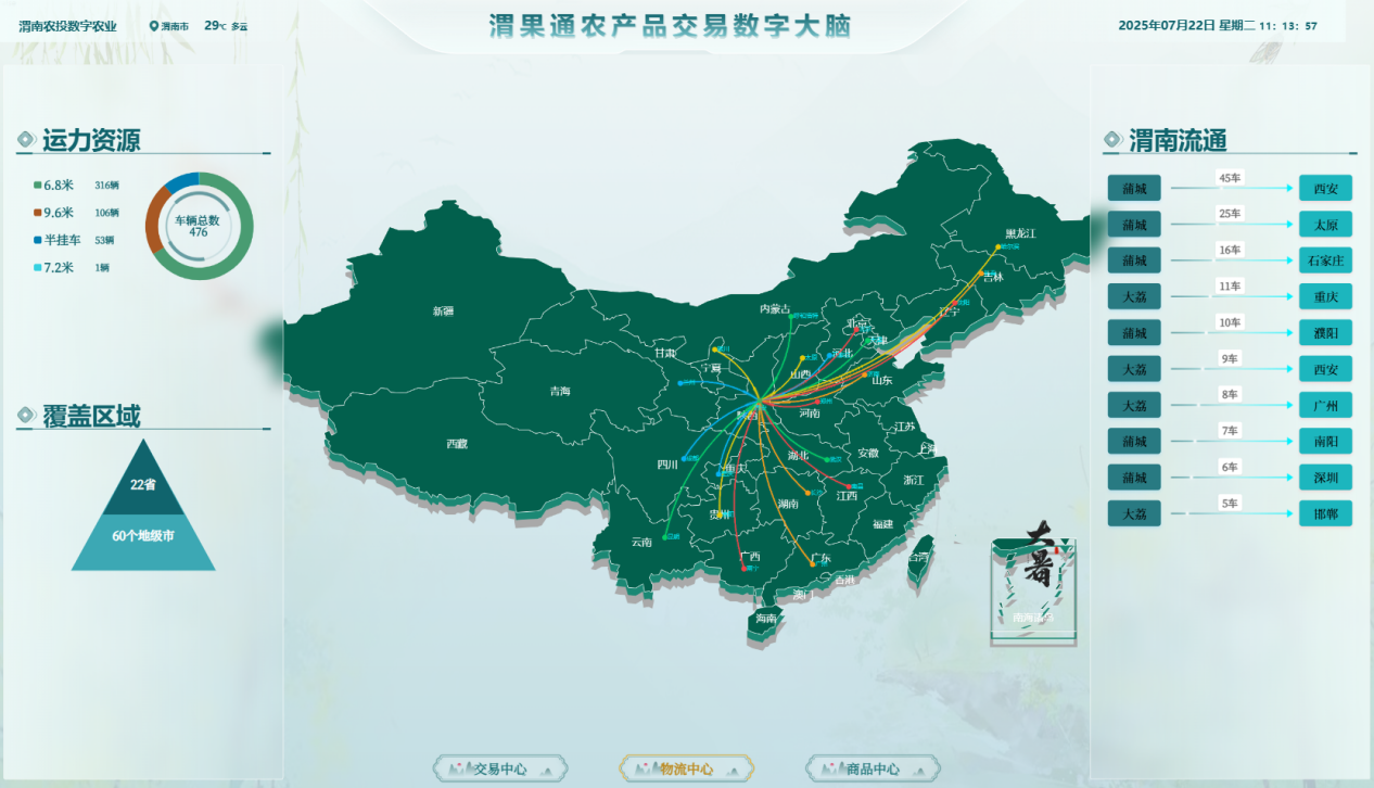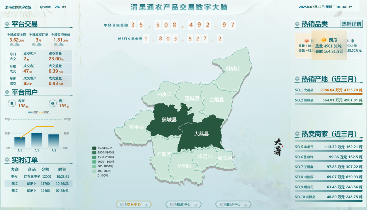 “渭果通”平臺是渭南市深化農業供給側結構性改革、推動農業數字化轉型的重要舉措,著力構建涵蓋“產地數字化大宗交易”“數字化精準助農服務”“農業先進生產力推廣”“產地品牌市場營銷”四大核心功能的綜合服務體系。截至目前,平臺已形成覆蓋重慶、太原、成都、石家莊等25個省(自治區)60余個地級市的全國性銷售網絡,累計吸引185家產地代辦及商戶、138家農批市場客商入駐,初步構建起貫通產銷的數字化業務生態。與此同時,平臺自2025年6月初正式上線以來,重點產區取得實質性突破:蒲城西瓜產區累計完成西瓜整車交易 4901.81噸,實現交易額 564.81萬元;大荔冬棗核心產區累計完成冬棗整車交易1902.10噸,實現交易額 2288.30萬元;多品類協同發展:覆蓋蒲城、大荔產區毛桃、胡蘿卜、馬鈴薯、葡萄、李子等特色農產品,累計交易 2474.86噸,實現交易額 700.13萬元。