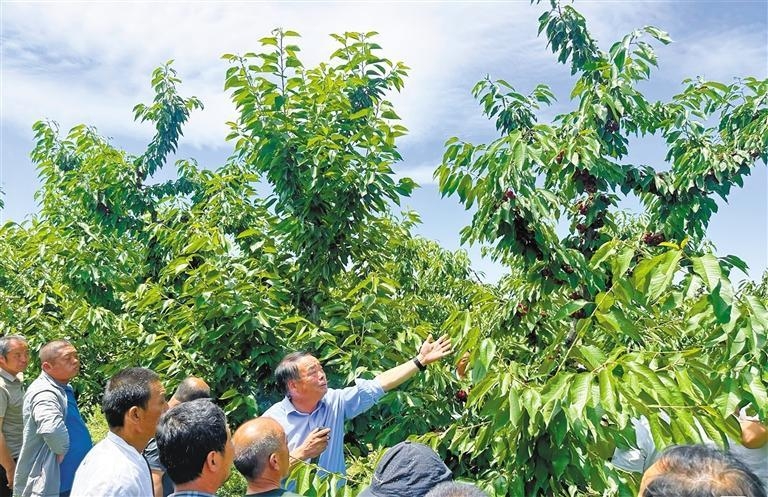 六月五日,在澄城櫻桃試驗站,渭南市櫻桃產業技術體系首席專家劉英俊(手持話筒者)講解櫻桃管理技術(資料照片)。? 記者 陳宏江攝