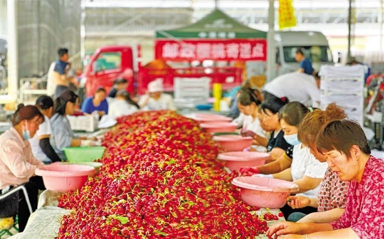 五月二十日,在澄城縣櫻桃交易市場,工人在分揀櫻桃(資料照片)。? 記者 陳宏江攝