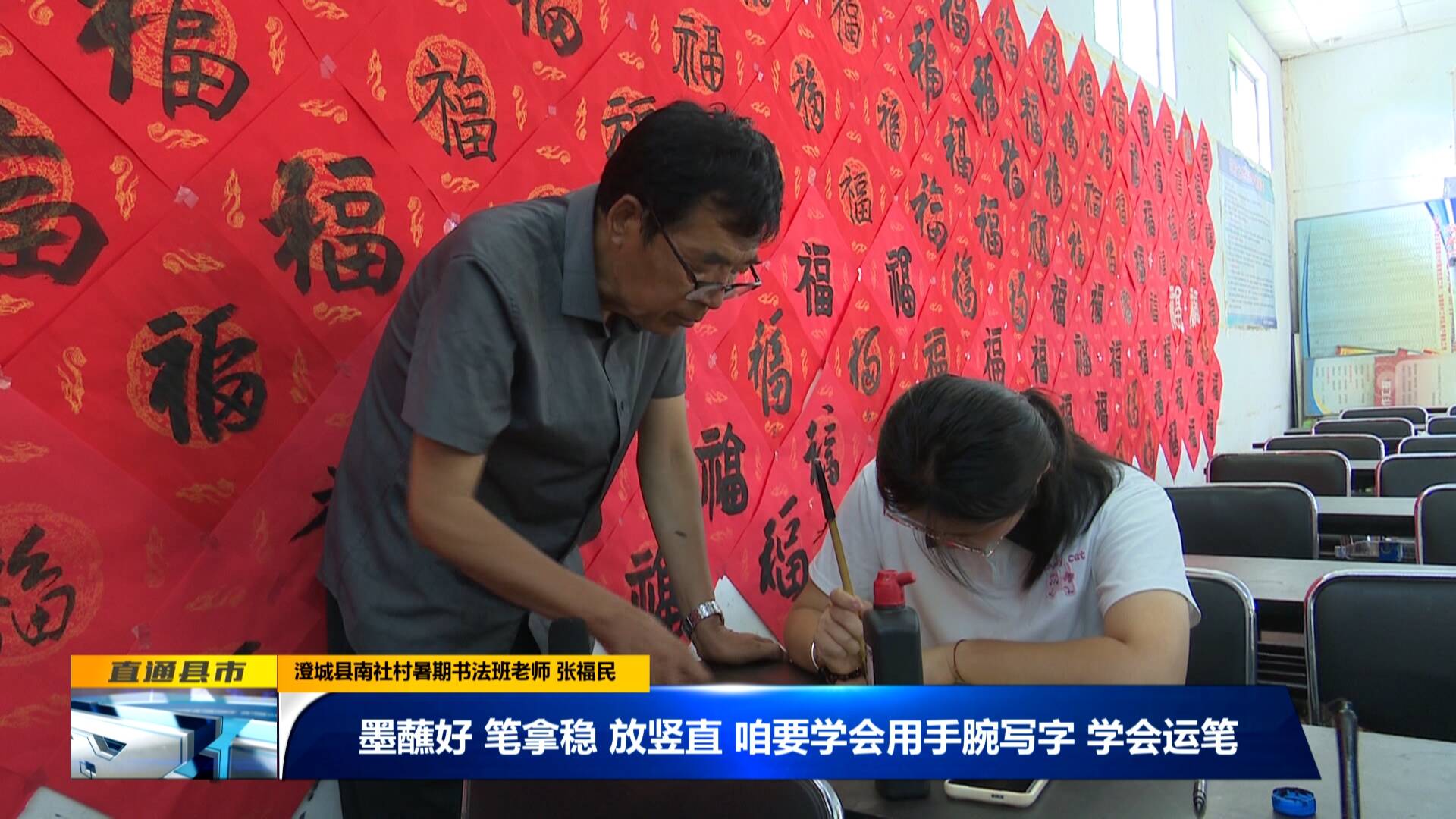 澄城縣南社村暑期書法班老師 張福民:“墨蘸好,筆拿穩(wěn),放豎直,咱要學會用手腕寫字,學會運筆。”