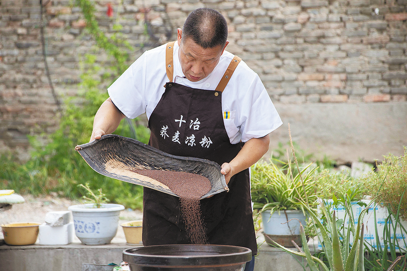 這份自豪源于對傳統(tǒng)的堅守。興樂坊蕎麥涼粉的制作要經(jīng)過十幾道復雜工序,每一道都馬虎不得。每天下午三四點,雷建文就會鉆進廚房,開始長達6個小時的“修行”:陜北來的蕎麥要先挑揀出雜質,曬干后用石碾磨成粉,篩出粗粒,加水反復揉搓出漿汁,再一遍遍稀釋去渣……雷建文介紹,其中最考驗功夫的就是攪拌,要在灶臺前不停地用木鏟攪拌一個多小時,既要防糊底,又得盯著火候。