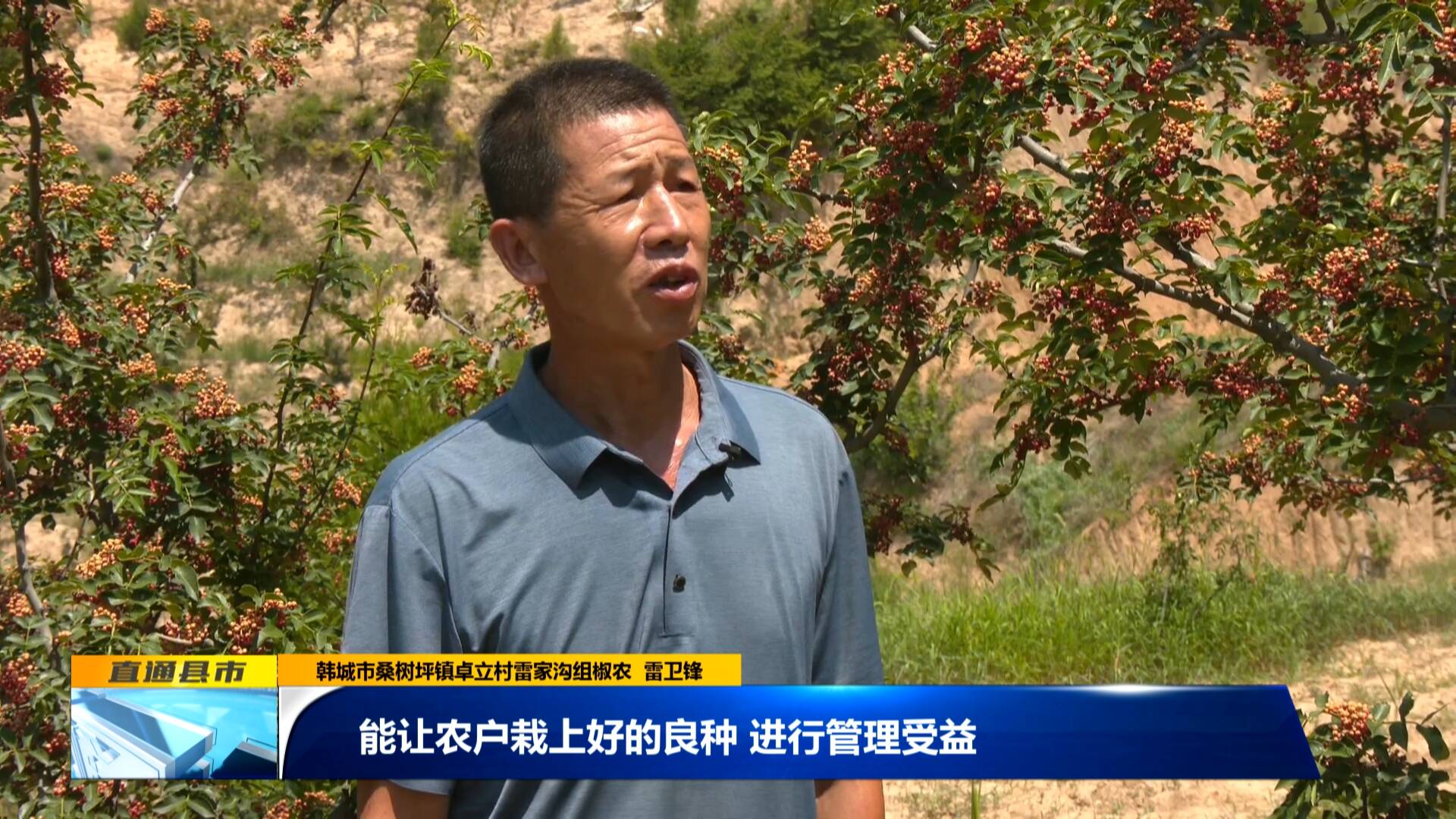 韓城市桑樹坪鎮卓立村雷家溝組椒農 雷衛鋒:“今后的花椒種植發展中,我要慢慢地把這個老椒園全部要改造成咱們橘紅品種,在今后我們把這個苗木擴大發展,能讓農戶栽上好的良種,進行管理受益。”