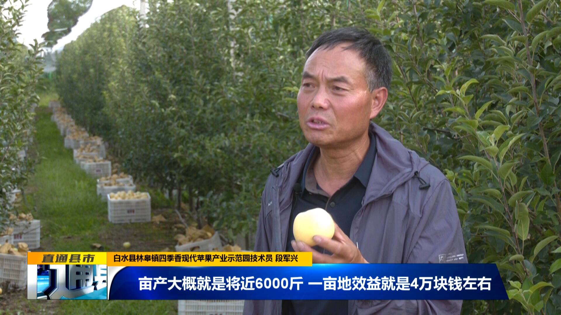 白水縣林皋鎮(zhèn)四季香現(xiàn)代蘋果產(chǎn)業(yè)示范園技術(shù)員 段軍興:“都是75、80的蘋果,70以上一斤8塊,畝產(chǎn)大概就是將近6000斤,一畝地效益就是4萬塊錢左右。”