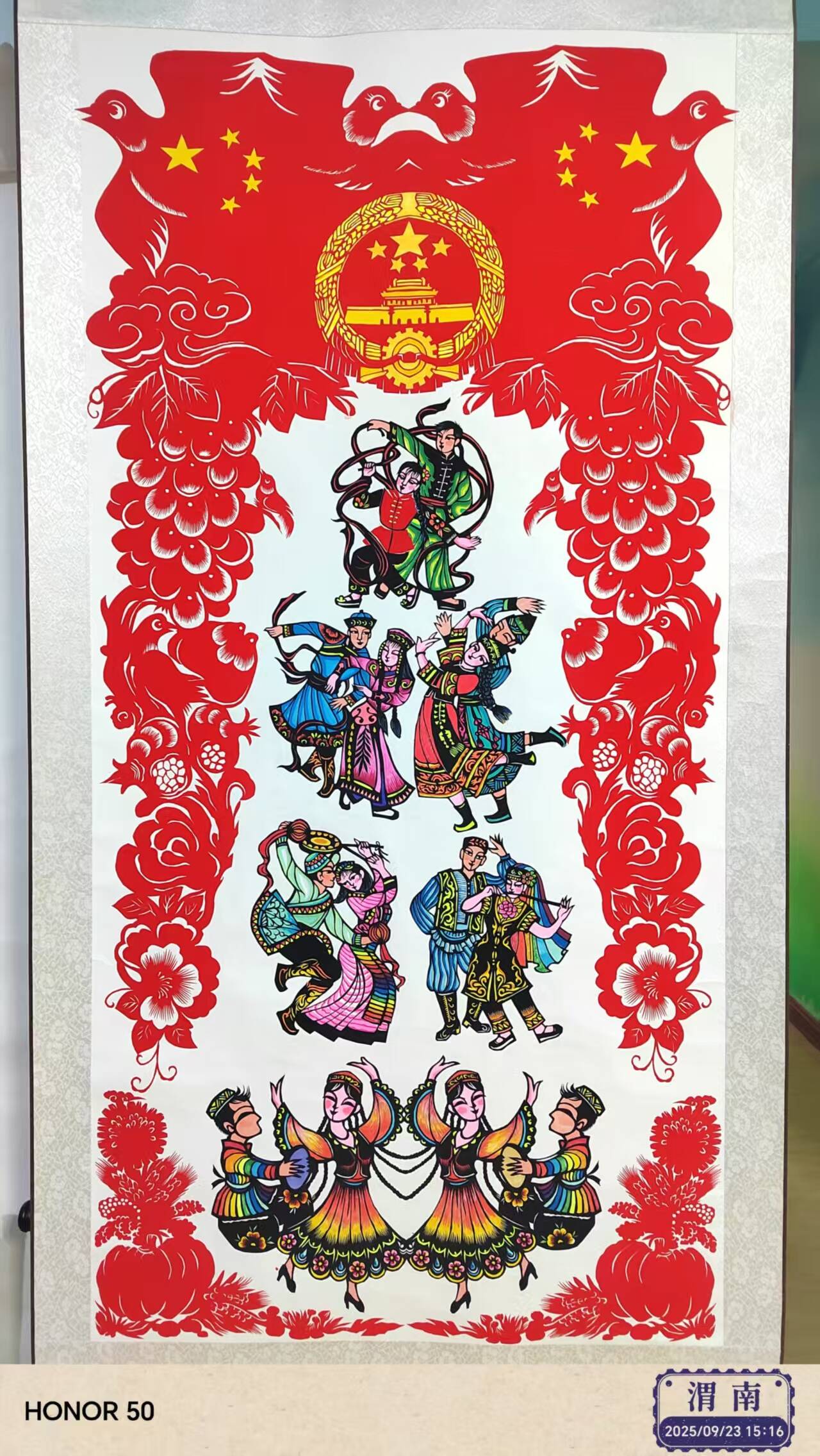曹靜深耕剪紙藝術數十載,代表作《關中記憶》曾代表陜西斬獲全國工藝美術精品展銅獎。國慶臨近,她精心創作彩色剪紙《歡慶祖國華誕》,運用染色、疊色、襯色等技法,將各族人民載歌載舞的場景置于畫面中央,國旗、和平鴿、祥云與豐收果實環繞其間,既延續了臨渭剪紙“以心造型、以理造型、以美造型”的傳統,又以多層次色彩疊加帶來強烈的視覺沖擊,盡顯節日喜慶。