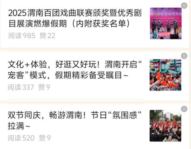 《陜西日報》、《三秦都市報》、陜西省文化和旅游廳官方微信公眾號、西西新聞等省級主流媒體、平臺聚焦華山景區濃厚節日氛圍,韓城古城和司馬遷祠景區“千年韓城韻,國慶非遺行”主題系列文旅活動,潼關古城、中華郡景區特色活動、體驗項目、客流量以及少華山盤龍嶺索道、假日文旅活動、景區服務等進行宣傳報道。