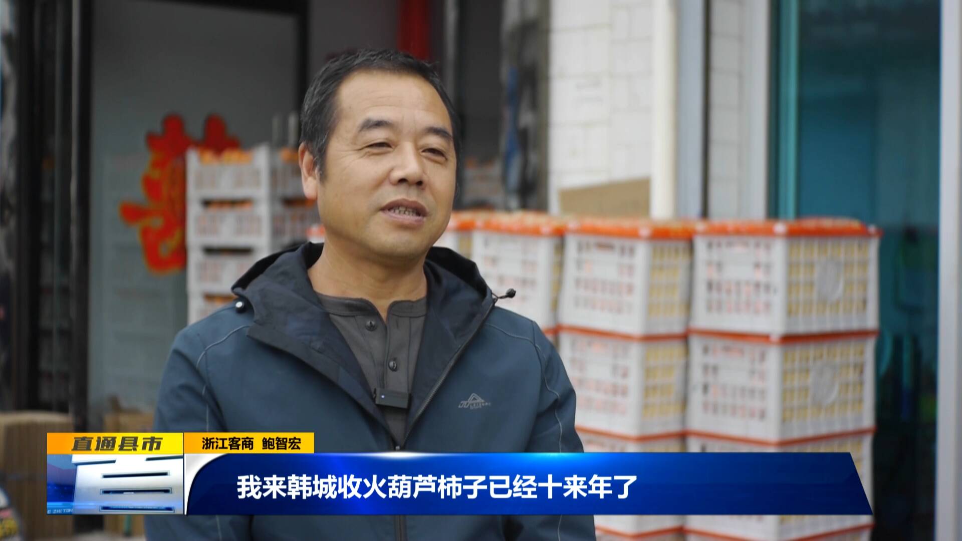 浙江客商 鮑智宏:“我來韓城收火葫蘆柿子已經十來年了,這里的火葫蘆(柿子)質量是最好的,在我們市場深受歡迎。我計劃在這里收50萬斤,現在已經入庫20萬斤了。”