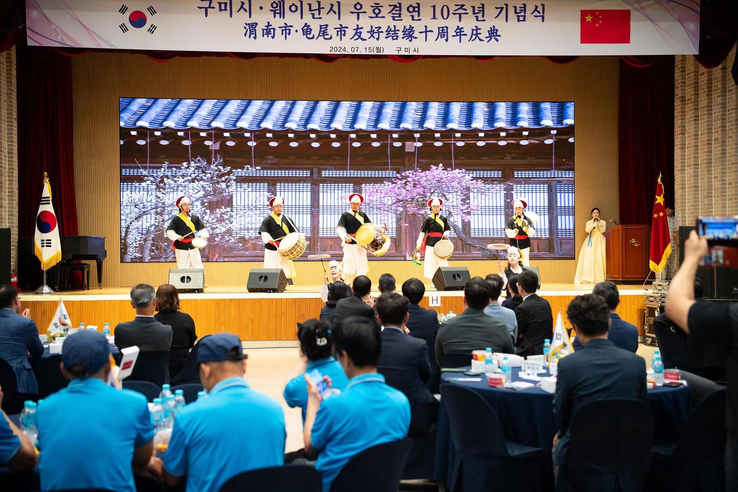 在紀念儀式上,兩市回顧了十年來在交流方面取得的成果,共同謀劃了兩市未來的合作方向;期待兩市以結好十周年為契機,將兩市關系提升為全產業合作關系,開展更多有意義、務實有效的交流合作。兩市相關人員全面介紹了經貿、文旅等產業方面的情況;同時,渭南國家級非物質文化遺產老腔等與龜尾市韓都來藝術團聯合呈現了精彩的傳統表演;兩市農產品企業共同展示了當地特色農產品。