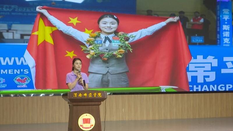 當天上午,在市體育局、渭南師范學院相關領導陪同下,白雨露踏入渭南師范學院,率先參觀云帆體育館,感受濃厚的校園體育氛圍。隨后,在專題報告會上,白雨露深情講述自己從接觸臺球到登上世界冠軍領獎臺的成長故事,從父親的二手臺球桌開啟臺球夢,到在教練指導下日復一日刻苦訓練,用樸實言語道出堅持的力量。她激勵在場學子,無論遇到何種困難,都要堅守初心,刻苦學習,以奮斗書寫報國篇章。互動環節中,學生們積極提問,白雨露耐心細致解答,還為大家簽名留念,現場洋溢著熱烈氛圍。