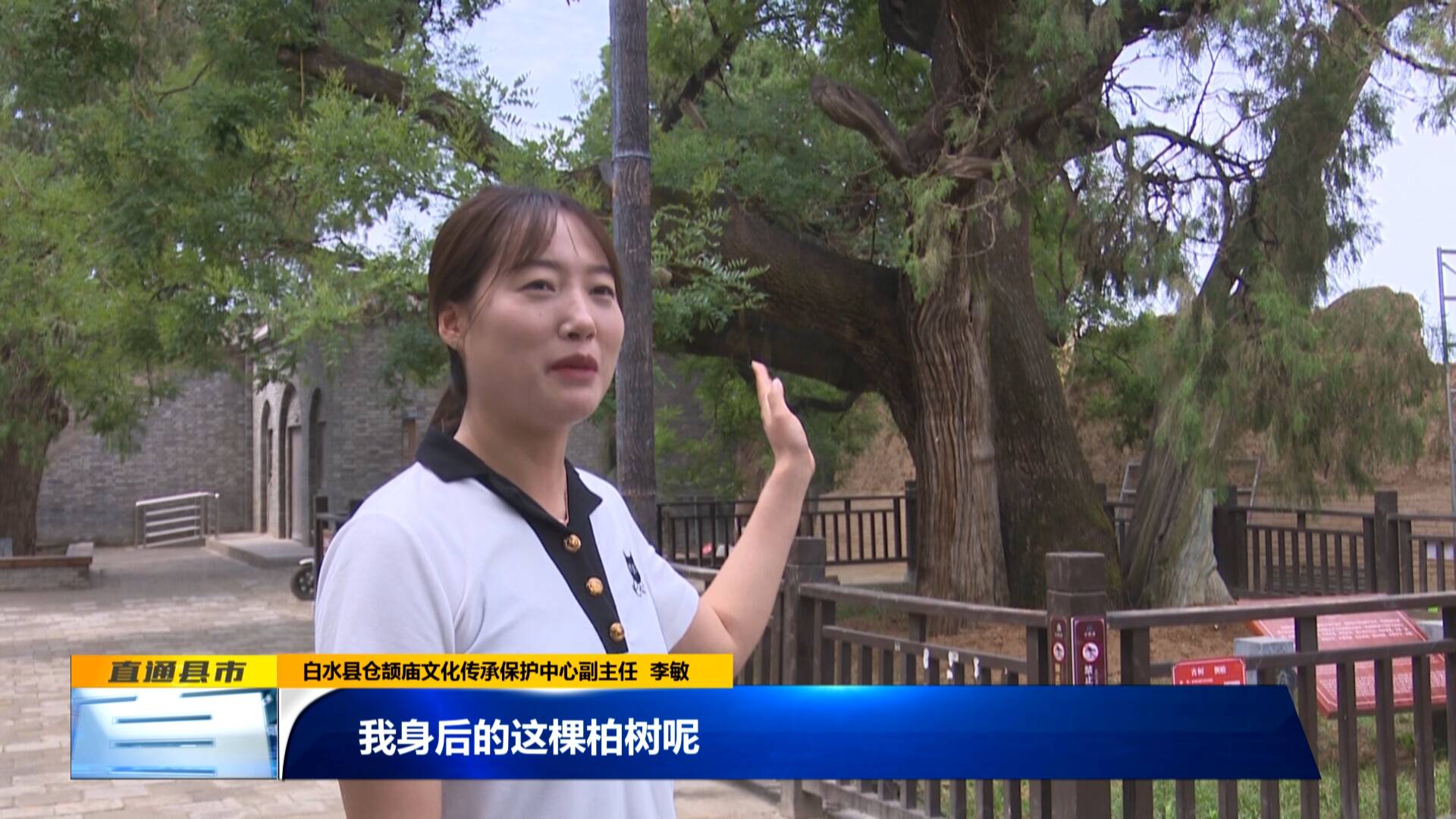 白水縣倉頡廟文化傳承保護中心副主任 李敏:“我身后的這棵柏樹呢,名叫‘柏抱槐’,距今四千余年。說是一棵樹,但是它由兩棵樹組成的,外側古柏里側古槐,外面的古柏距今是四千多年,而里面的古槐距今也有近兩千年的歷史(傳說)。”