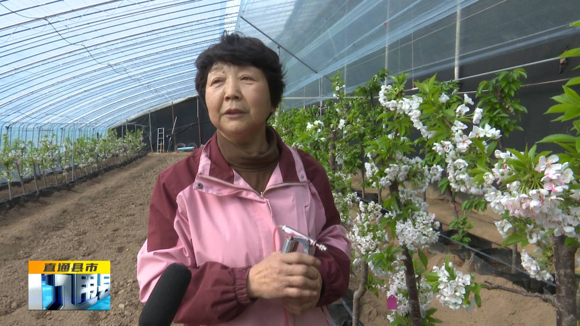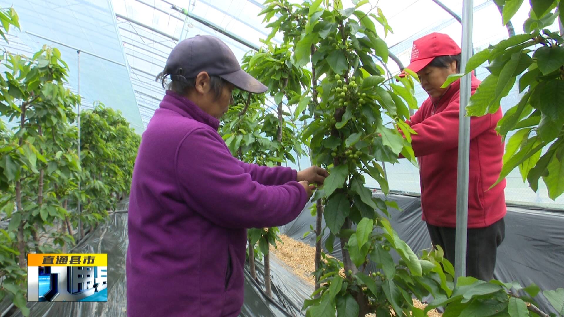 櫻桃大棚內溫暖如春。潔白如雪的櫻桃花競相盛放,清香怡人。技術員成秀麗和果農們腰挎噴壺,穿梭樹下花間,動作輕柔而熟練地為櫻桃花進行人工授粉。在另外一邊的櫻桃大棚里,已經坐果的櫻桃已經有黃豆大小,果農們手持剪刀,專注地剪去多余的果實,每一個動作都飽含著對豐收的期待。