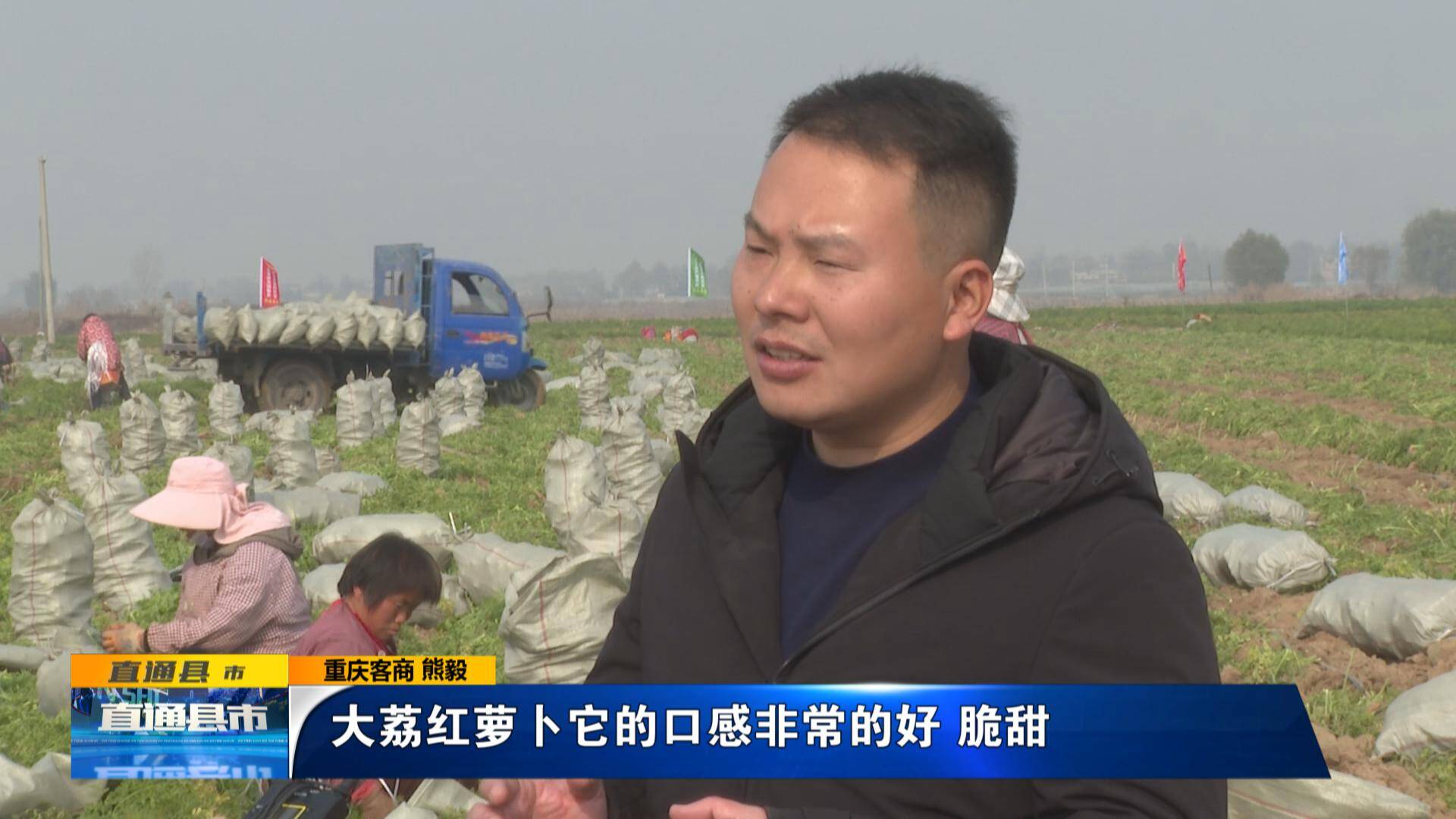 重慶客商 熊毅:“大荔紅蘿卜它的口感非常的好,脆甜,它的條形非常的直,顏色非常的紅,所以非常受重慶市民的喜歡,隨著大荔紅蘿卜的上市,我們每天的銷量也是一天比一天大,現在一天大概在四五十噸左右。”