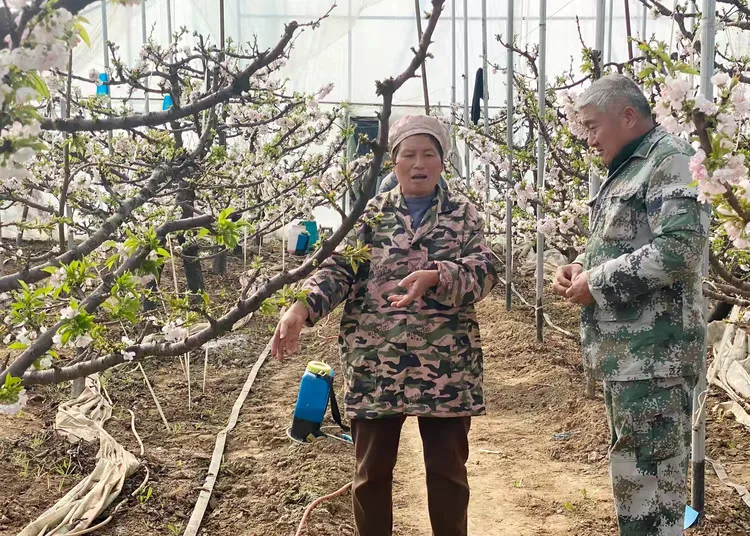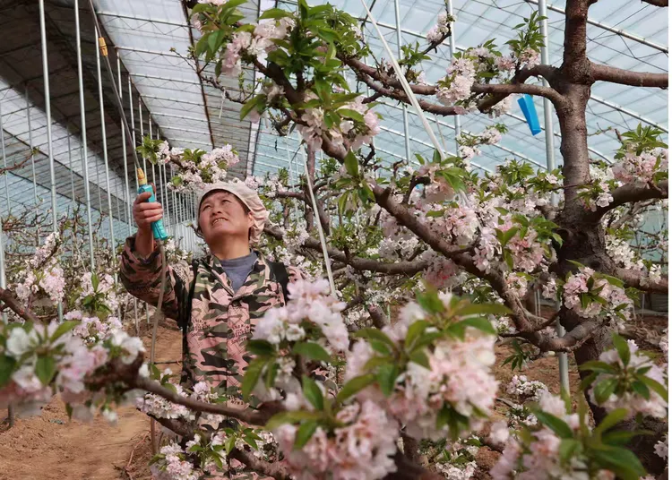 2月17日,在陜西大荔縣范家鎮雷北村四組村民石夢起家的12畝大棚櫻桃園里,其家屬張月紅正忙著給櫻桃進行人工授粉,為了今年櫻桃能豐收,她可是費了不少心思,預計畝收入可達5萬多元。