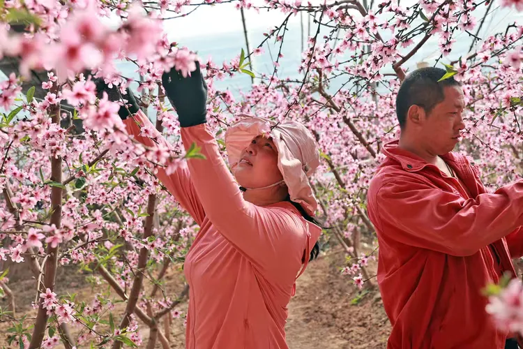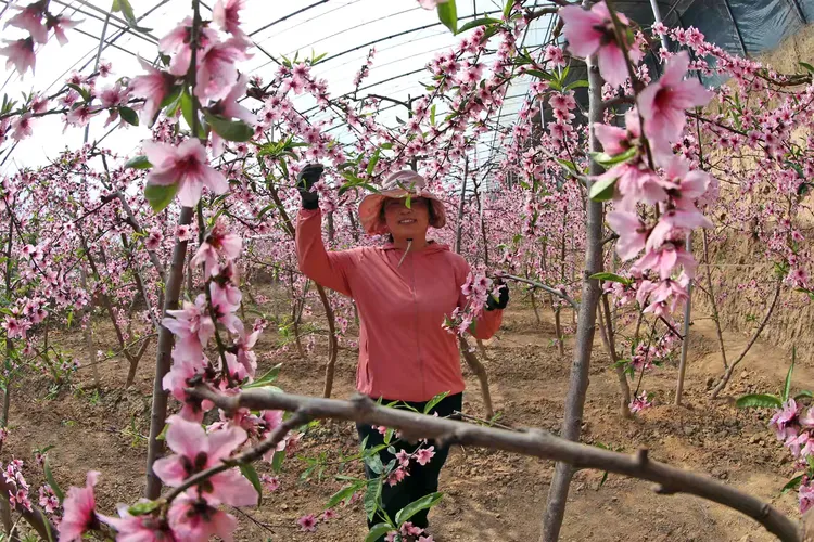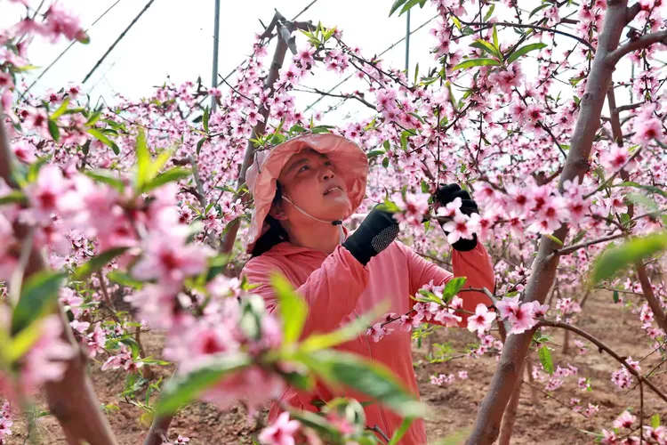 ??(通訊員:李世居 )二月,春風(fēng)輕柔地拂過大地。2月27日,漫步于大荔縣兩宜鎮(zhèn)豐潤村五組的黃蟠桃溫室大棚內(nèi),只見桃花競相綻放,粉白相間的花朵交織成一片絢爛的花海,處處洋溢著豐收的希望。據(jù)預(yù)計,每畝大棚黃蟠桃能帶來6萬余元的收入,這無疑是大荔縣蓬勃發(fā)展果業(yè)經(jīng)濟的一個生動縮影。