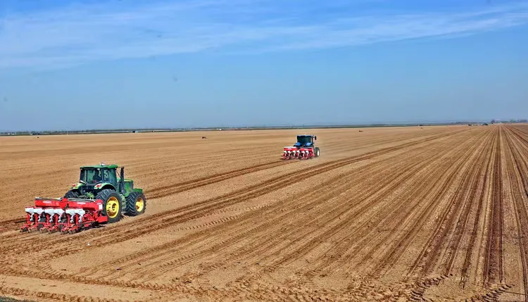 3月17日,隨著氣溫回升,在陜西大荔縣的廣袤田野上,處處呈現出一派爭分奪秒的春耕繁忙景象,千臺農機在田間大顯身手助農忙。