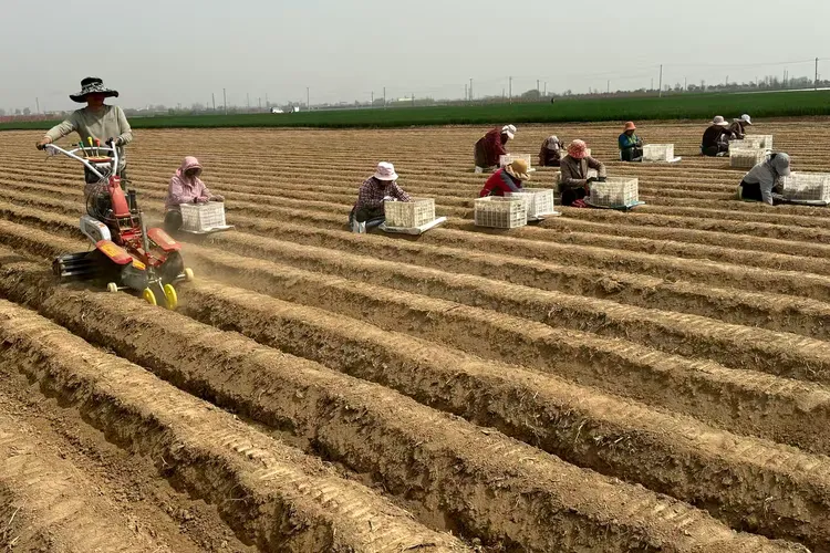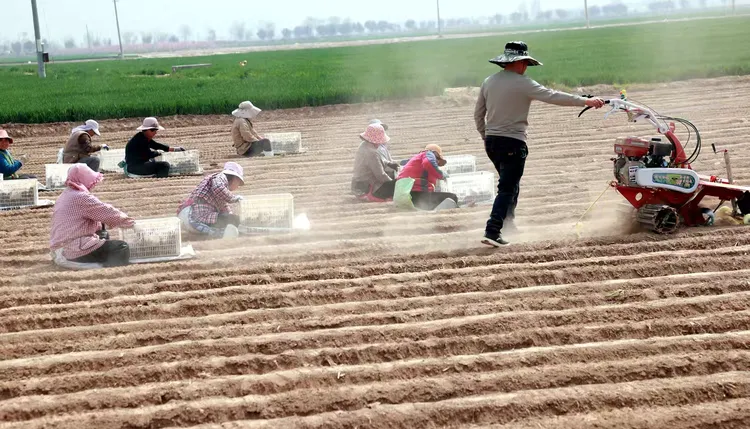 4月4日,在陜西大荔縣韋林鎮東高村,村民張西峰正于流轉的25畝沙土地上忙碌地種植大姜,期盼著能收獲一個美好的“姜”來。