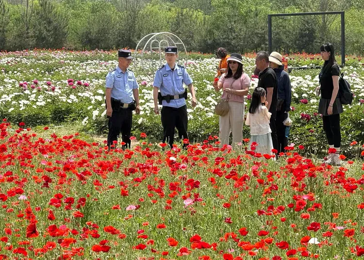 “您看,這種花叫虞美人,它和毒品罌粟花在葉莖茸毛多少上有明顯區別……”這是大荔縣公安局官池派出所民警在景區給群眾宣傳的情景。“五一”假期首日,陜西大荔縣沙苑牡丹園盛開的花卉園景區,執勤民警的身影隨處可見。他們不僅全力護航景區安全,還熱情地為群眾擔當向導,積極宣傳禁毒、防詐騙等安全知識,同時不忘時刻提醒游客注意人身和財產安全。