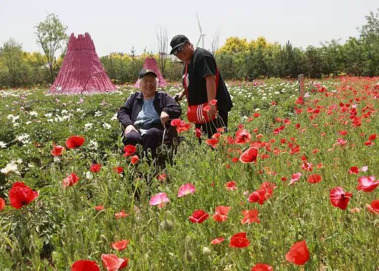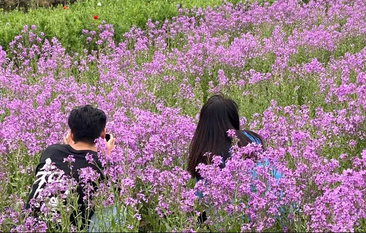 記者看到,艷麗純凈的芍藥花隨風搖曳,碩大花朵在空氣中散發出淡淡的花香;正在開放的藍香芥花海,猶如一片紫色的海洋蔚為壯觀;嬌羞的虞美人花開妖嬈,輕盈花冠似朵朵紅云片片彩綢翩翩起舞;而作為“女神”的玫瑰花綻開了笑臉,散發彌漫著少女般的美艷。
