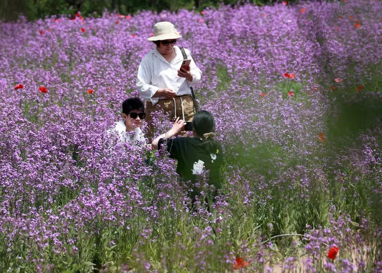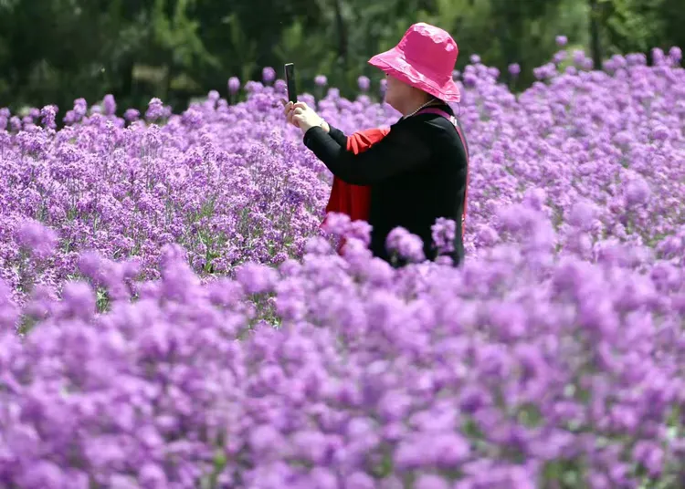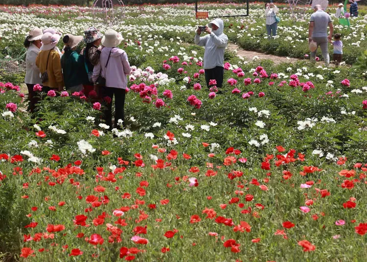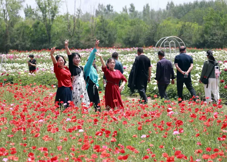 5月1日,陜西大荔縣沙苑牡丹園百余畝鮮艷奪目的芍藥、藍香芥、虞美人、玫瑰等花卉競相綻放,一望無際的“花花世界”成了游客五一假期的好去處,眾多游客在這里邂逅、相約,品賞美妙獨特的田園風光。