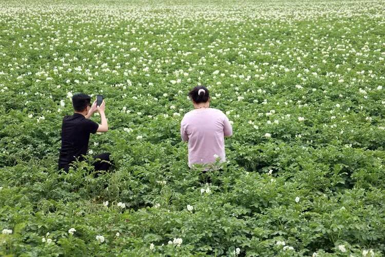 5月1 4日,走進陜西渭南市大荔縣沙苑的蘇村鎮、下寨鎮等地萬畝洋芋花散發的絲絲花香撲面而來,放眼望去田間仿佛展開了一幅色彩斑斕的畫卷,迷人的景致吸引了群眾在此賞花打卡,陶醉于這片花的海洋之中。