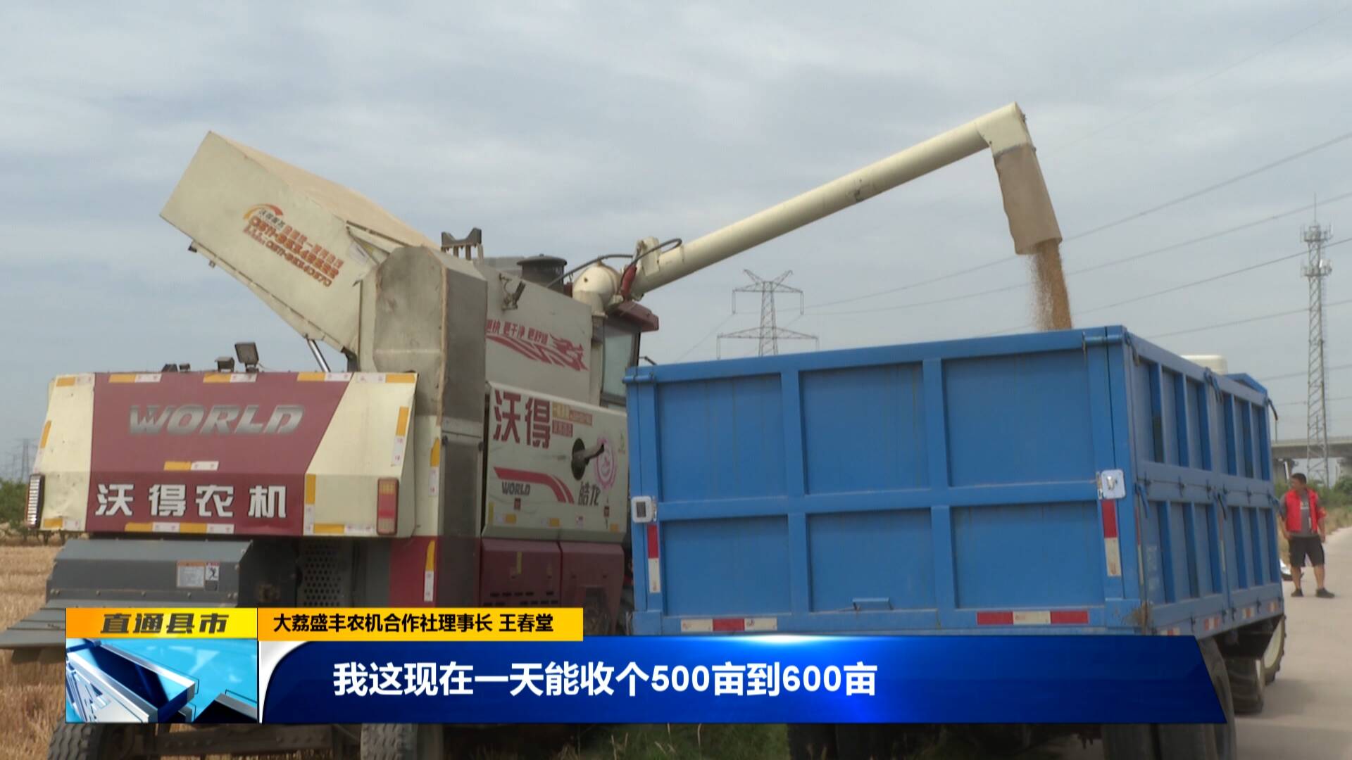 大荔盛豐農機合作社理事長 王春堂:“合作社今年托管了有8000多畝面積,我自有面積有1000多畝,農戶托管了有6000多畝。今年這小麥長勢還可以,我這是洛灌區,水利條件也好,預計產量在400公斤以上。我這現在一天能收個500畝到600畝,預計就是一個禮拜左右就可以收完。”