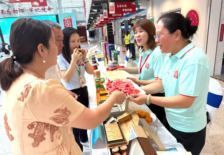 “我頭一回吃到這么又甜又脆的冬棗!”“你們這同州大西瓜,皮薄沙甜,真不錯!” 6月19日,深圳海吉星市場上大荔農產品展位上洋溢著甜蜜與驚喜,以大荔特色地標產品為代表的大荔農產品驚艷登場,引得深圳市民紛紛駐足品鑒稱贊。