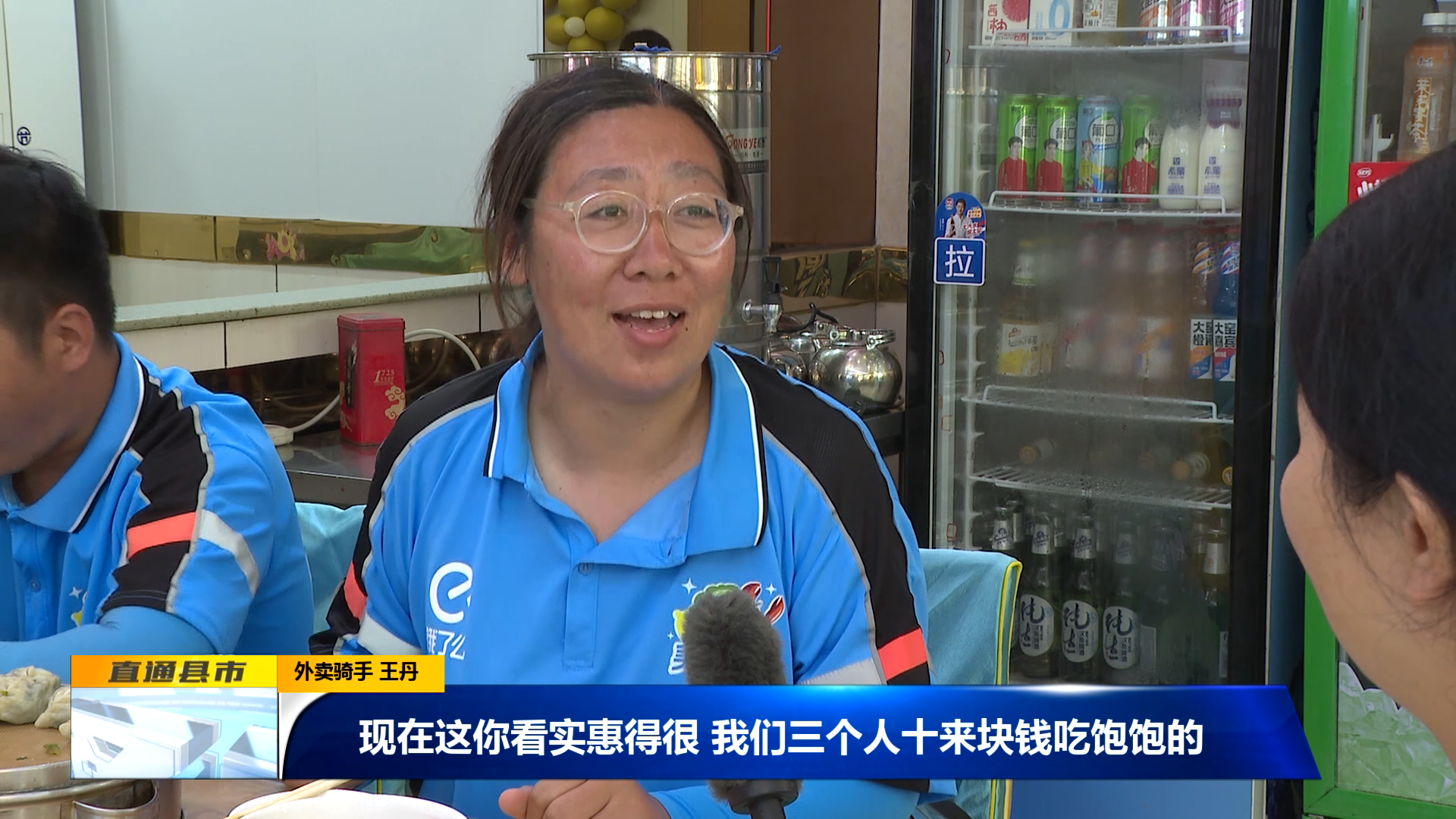 外賣騎手 王丹:“現在這你看實惠得很,我們三個人十來塊錢吃飽飽的,種類還多,樣數還多,合適得很。”