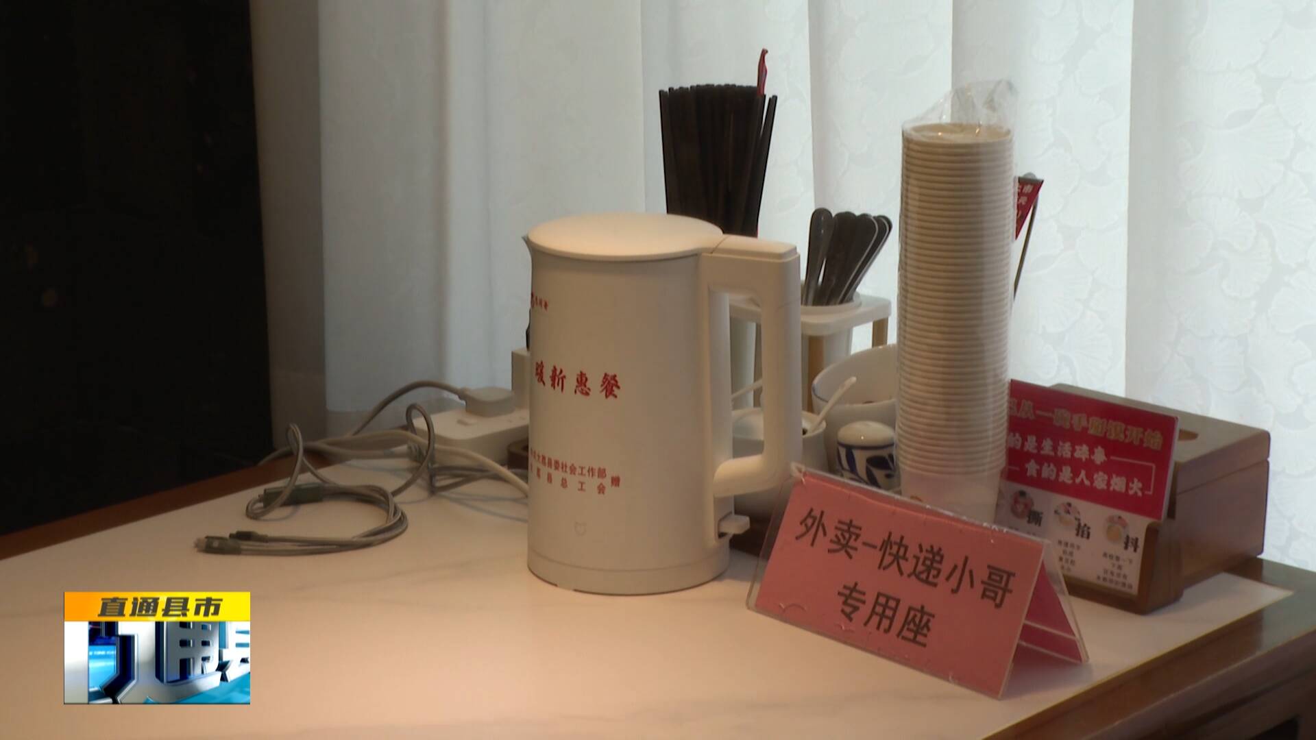 此外,在大荔縣一家餐飲店,“外賣小哥”專座上整齊地擺放著水壺、水杯、充電器等物品,前來取餐、休息的外賣員絡繹不絕。