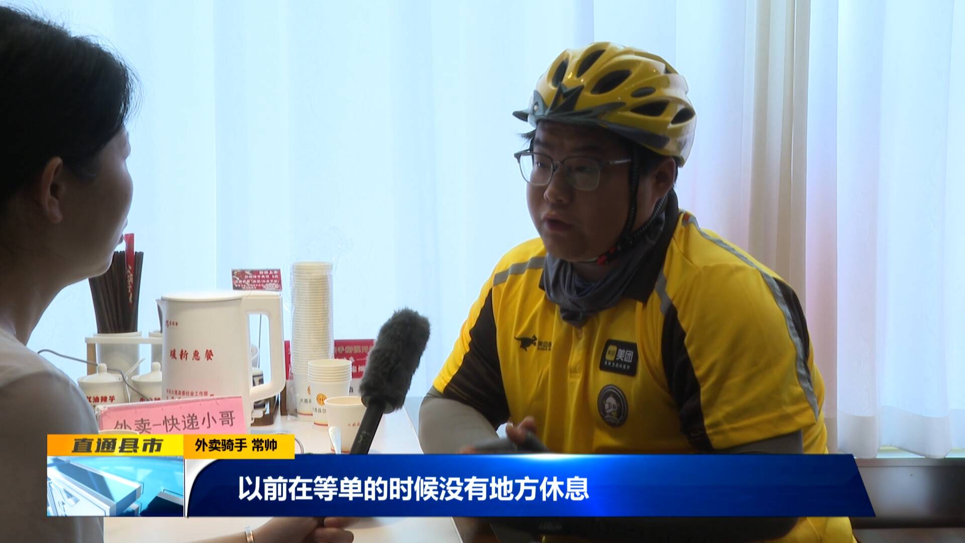 外賣騎手 常帥:“以前在等單的時候沒有地方休息,在外面都是蹲著、站著。現在咱店里為咱外賣小哥也配了專屬的外賣座位,在等餐的時候也為咱提供了免費的飲品,這樣的態度就對我們就是非常暖心。”