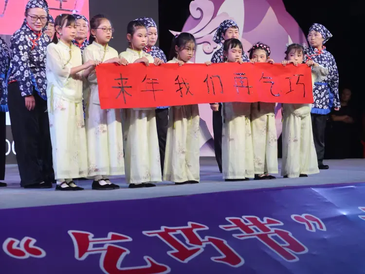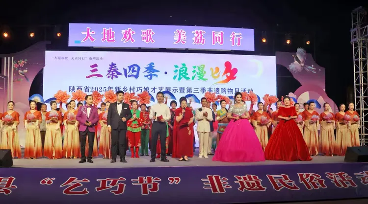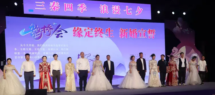 “乞巧節”非遺民俗展演無疑是活動的一大亮點,為整個節日增添了濃郁的色彩。舞臺上,“乞巧節”的搭乞巧棚、縛巧姑、迎巧姑、磨碗乞巧等7個傳統環節被生動地呈現出來,古老的民俗在現代舞臺上煥發出全新的生機與活力。8對新婚青年在“鵲橋會 - 緣定終生”集體新婚宣誓中,許下了相伴一生的美好諾言,以傳統儀式為依托,倡導了文明簡約的婚俗新風尚。來自榆林府谷的《掛紅燈》、商洛市的《這山望見那山高》、潼關縣的《黃河謠》等非遺文藝節目輪番登臺獻藝,戲曲、鑼鼓、器樂等多種藝術形式相互交織,為觀眾帶來了一場視聽的饕餮盛宴,讓大家在欣賞節目的同時,深刻領略到七夕文化的豐富內涵。