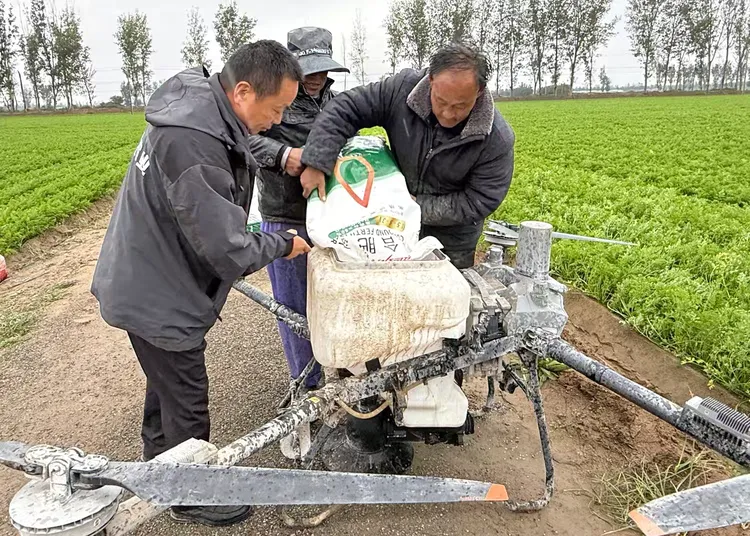 10月20日,大荔縣荔盛紅蘿卜專業合作社的田間卻一派忙碌景象——兩架無人機冒著小雨在6千畝紅蘿卜田上空輕盈穿梭,螺旋槳帶起的氣流攪碎雨霧,在操作人員的精準操控下,肥料均勻播撒,落在翠綠的紅蘿卜葉上,融入濕潤的土壤里。