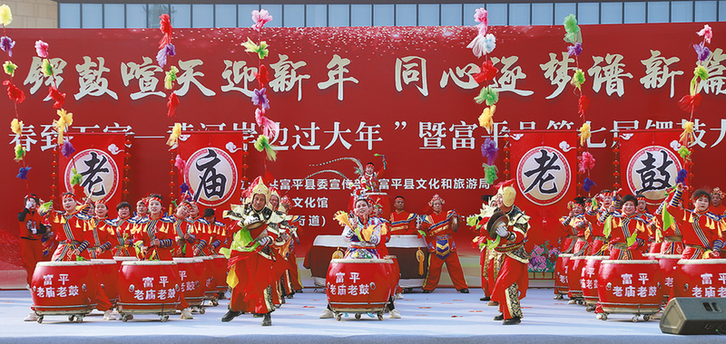 1月22日,“春到萬家——黃河岸邊過大年”暨富平縣第七屆鑼鼓大賽在該縣城市文化中心舉行,來自富平縣各鎮(街道)的17支參賽隊展開了一場精彩絕倫的鑼鼓技藝大比拼。