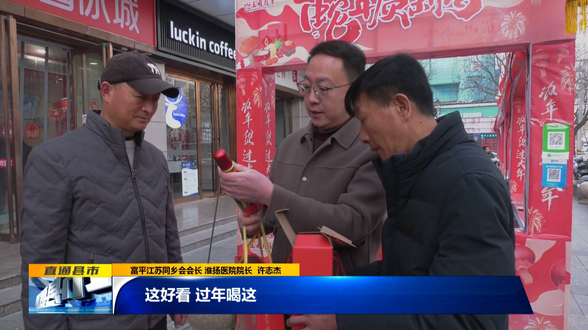 富平江蘇同鄉會會長 淮揚醫院院長 許志杰:“這好看,過年喝這,讓老家人嘗一嘗富平的特產。我是拿的老下數,每年給老家帶些‘富平柿餅 甜蜜中國’嘛。曹村的吊柿,霜已經上滿了。”