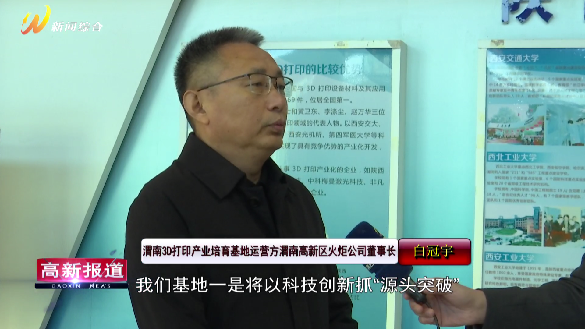 “‘十四五’期間,渭南3D打印產業培育基地整體營業收入預計從‘十三五’末的3億元增長至今年底的8億元,經濟增長將翻近3倍;科技型中小企業從‘十三五’末的34家增長至68家,高新技術企業從‘十三五’末的12家增長至45家。‘十五五’時期,渭南3D打印產業培育基地在以科技創新助力這個聚集區發展、持續為全省產業創新發展創造經驗、推進中國式現代化方面有什么新打算呢?我們采訪一下渭南3D打印產業培育基地運營方渭南高新區火炬公司董事長白冠宇。”渭南廣播電視臺主持人姜克非說。
