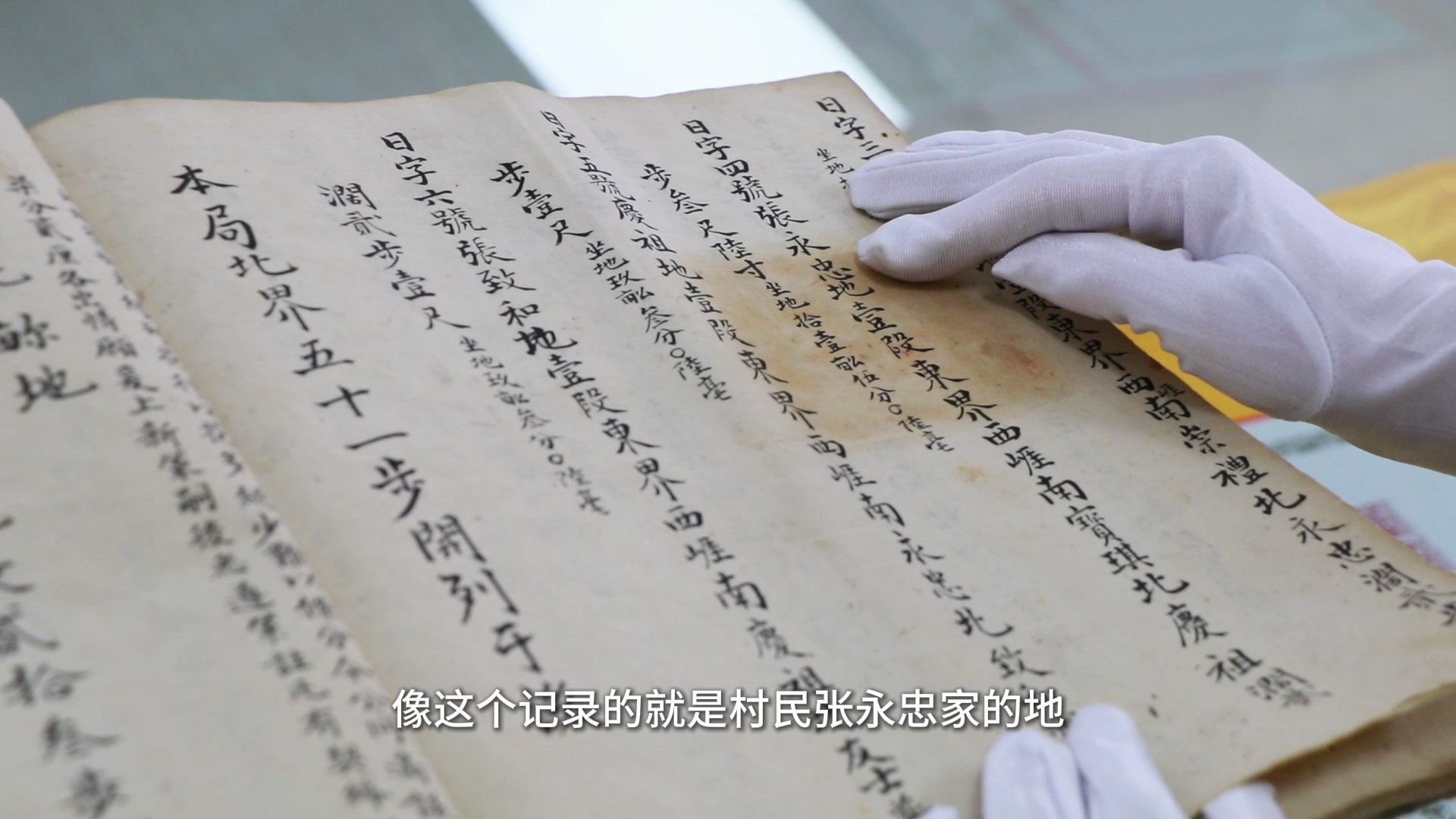 韓城市檔案館 衛曉艷:“比如像這個記錄的就是村民張永忠家的地,它是這樣寫的。日字四號,張永忠地一段,東界西崖,南寶琪,北慶祖,闊二步三尺六寸,坐地十一畝五分零六毫。”