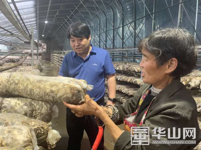 張王濤(左一)在香菇園區詢問務工群眾收入情況